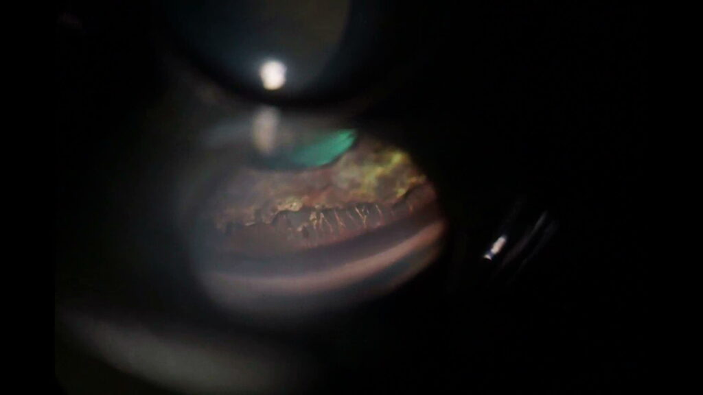 FDIMの早期病変は虹彩表面の色素沈着(メラノーシス)から始まります。この病変は数ヶ月〜数年かけて緩徐に進行することが一般的ですが、進行しない場合もあれば、時に急速に進行する場合もあり、臨床経過の予測は困難です。メラノーシスから腫瘍期へ移行しているか否かの評価には病理組織学検査が必要です。病理組織学的評価のためには虹彩生検が必要となります。