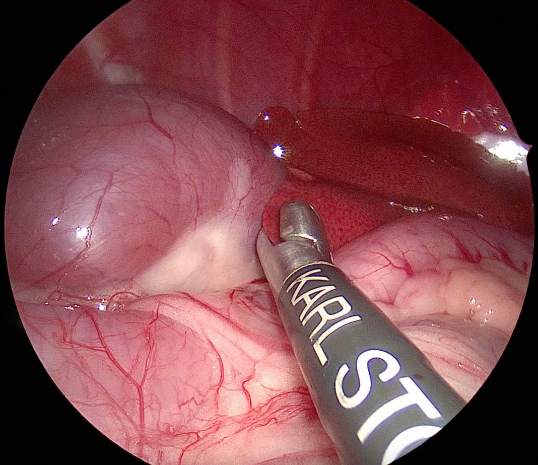 潜在精巣とは陰嚢内に精巣が降りていない状態のことをいいます。 潜在精巣は正常な精巣に比べて腫瘍化するリスクが高いといわれ、外科摘出が推奨されます。腹腔内に潜在精巣がある場合には 腹腔鏡を使用することで小さな切開創で腹腔内の精巣を摘出することができます。