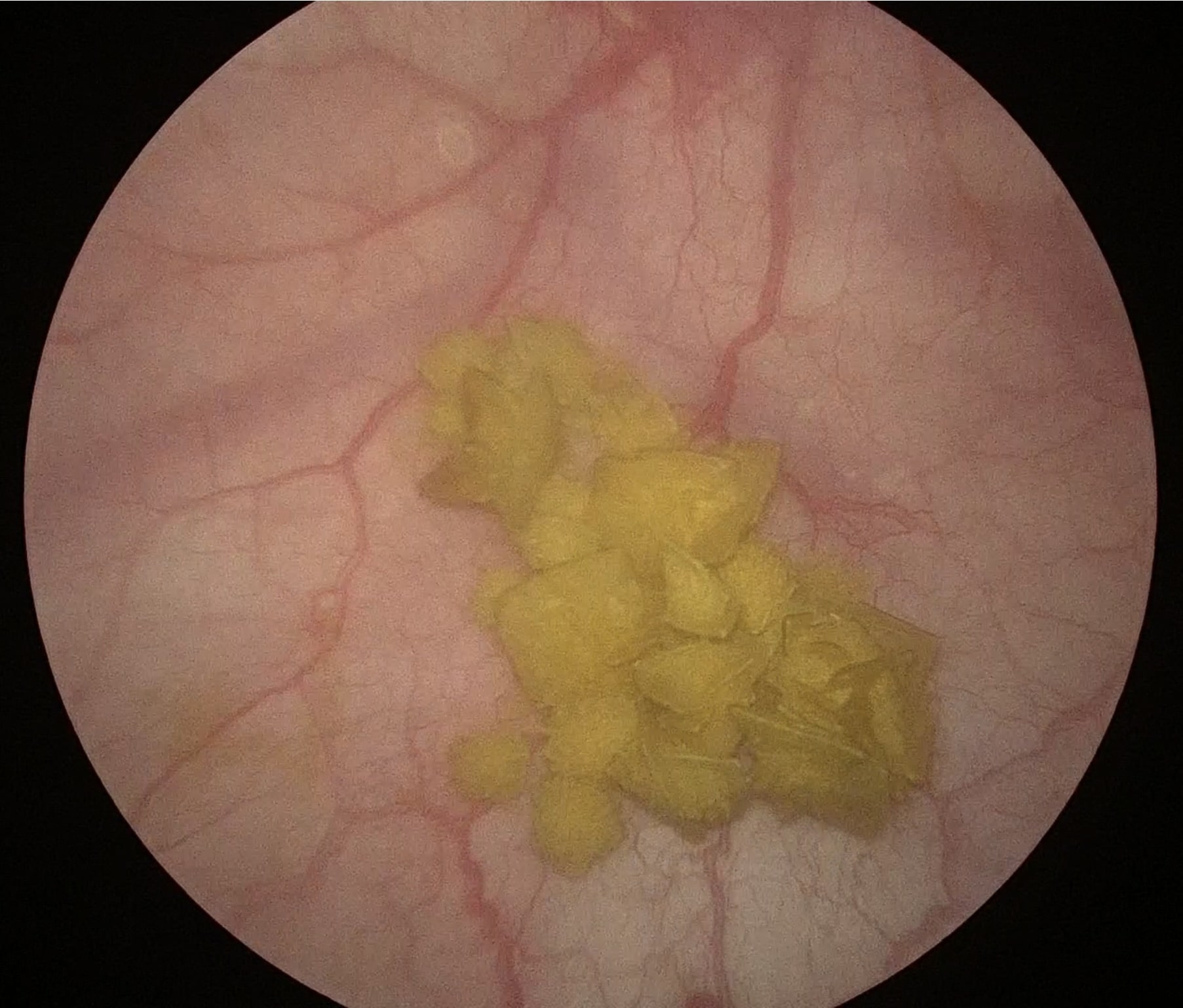 膀胱結石摘出の手術を腹腔鏡で行うことにより通常の開腹手術より傷口を小さくできる他、肉眼では確認できない微小の結石をカメラを通して摘出するので取り残しを極めて少なくすることができます。